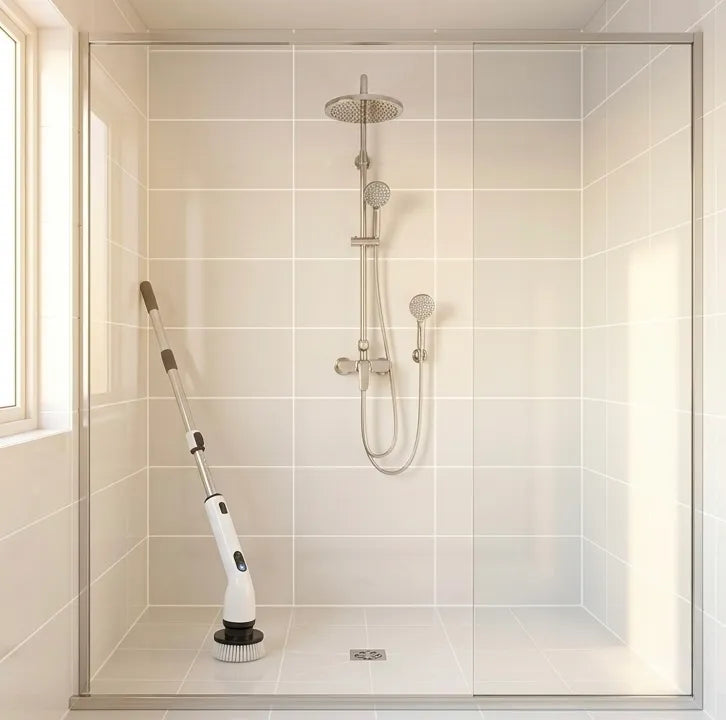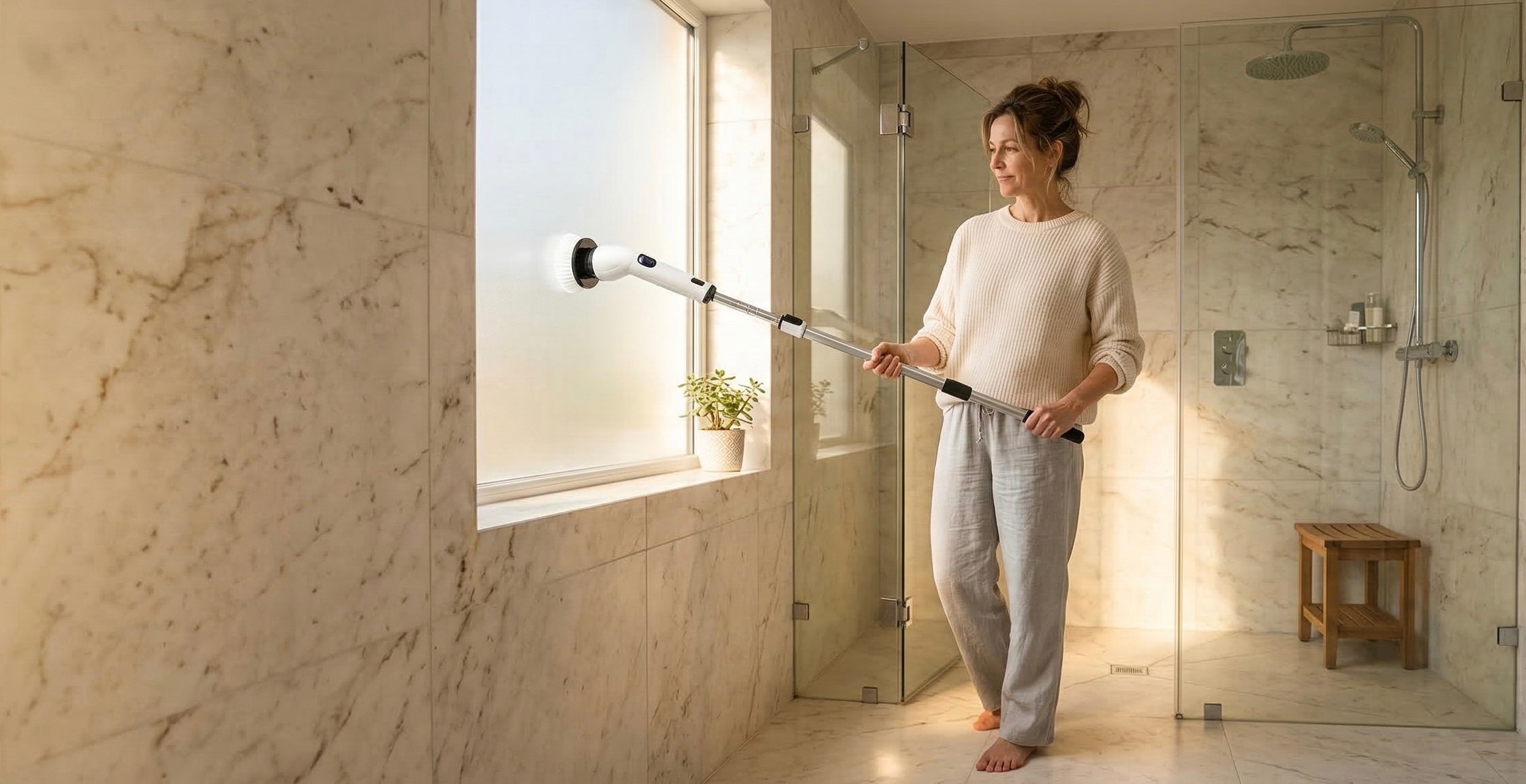 AFTER: Fifteen minutes. No kneeling, no bending, no back pain tomorrow. The motor does every bit of the work while you guide it effortlessly across every surface. You step back, look at your bathroom, and feel something you haven't felt in years - genuine pride in your home.